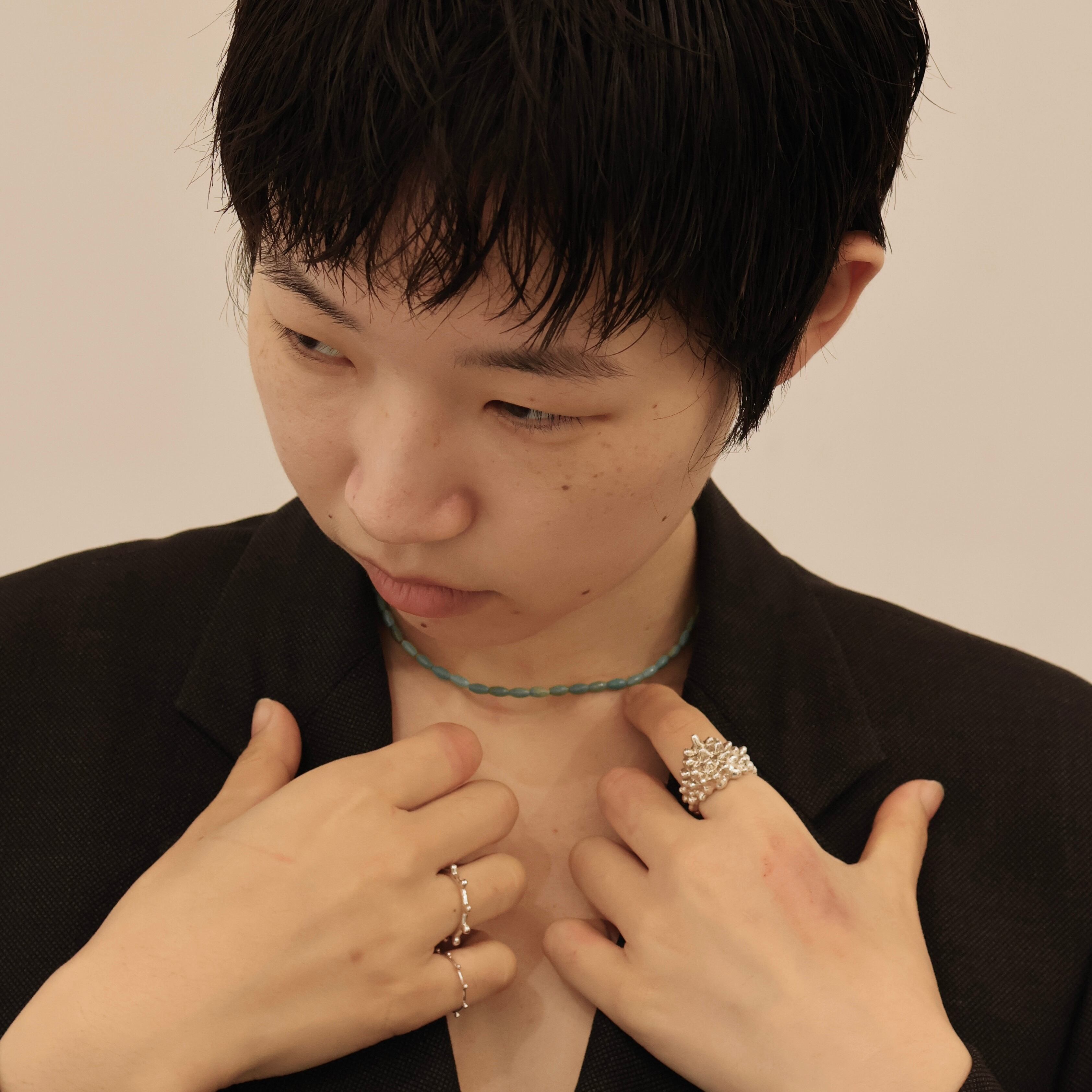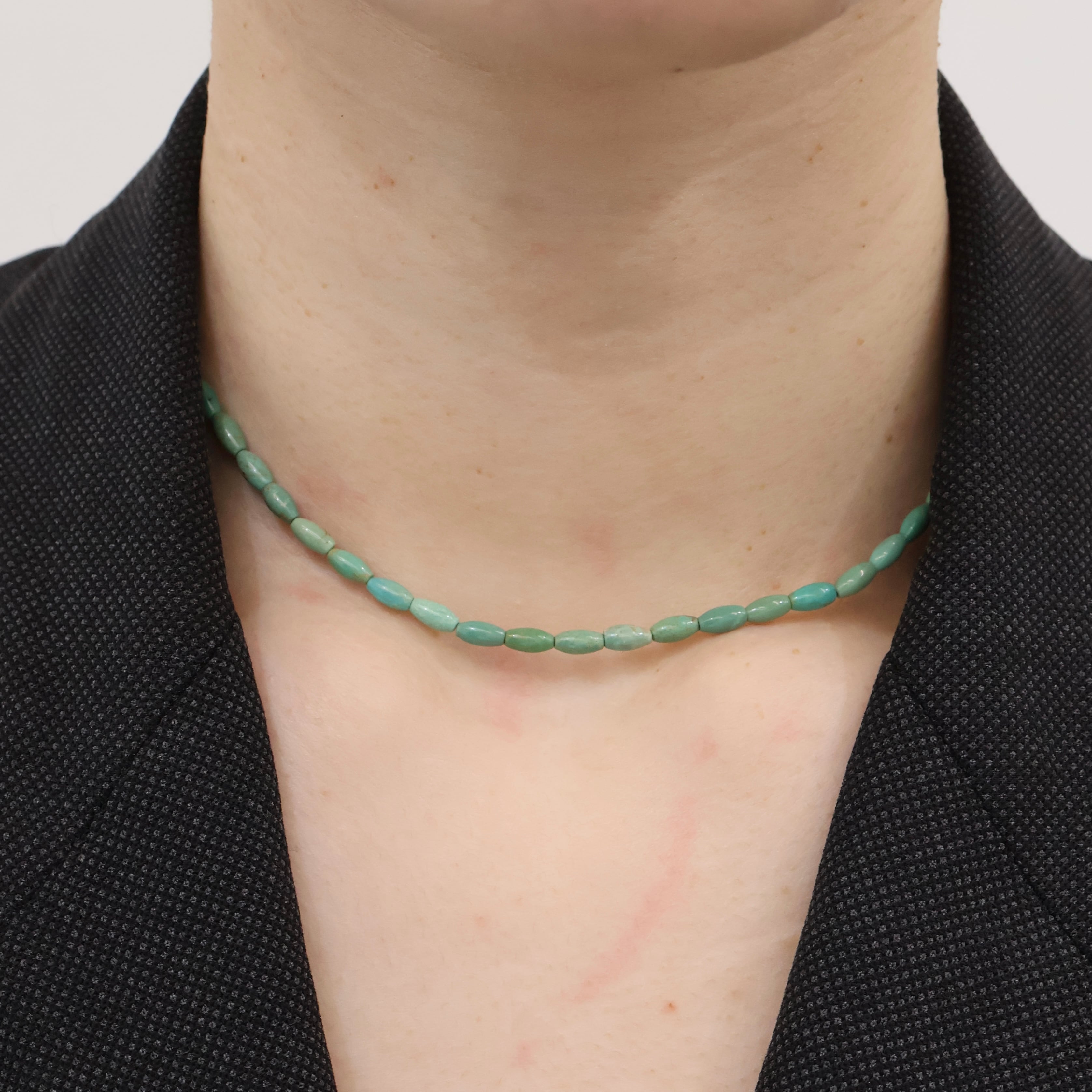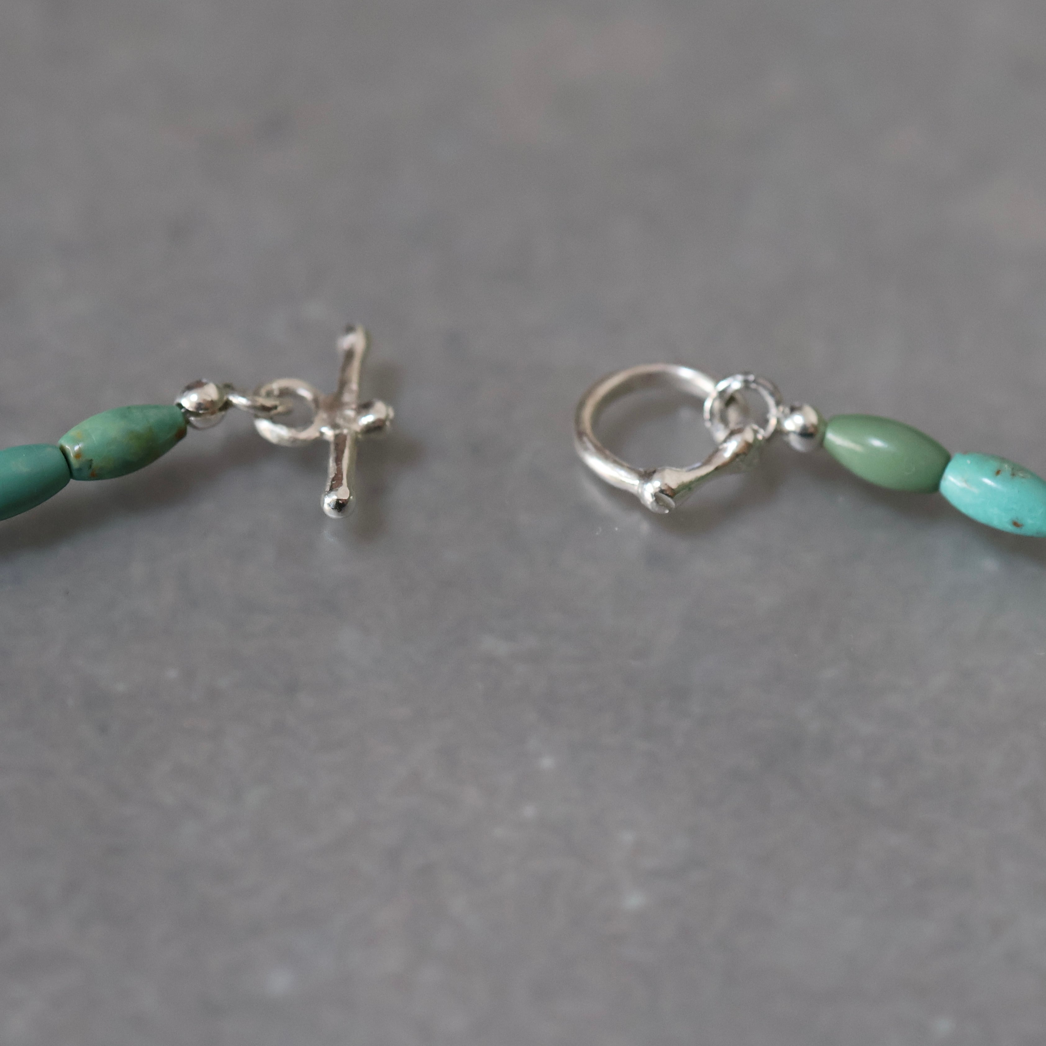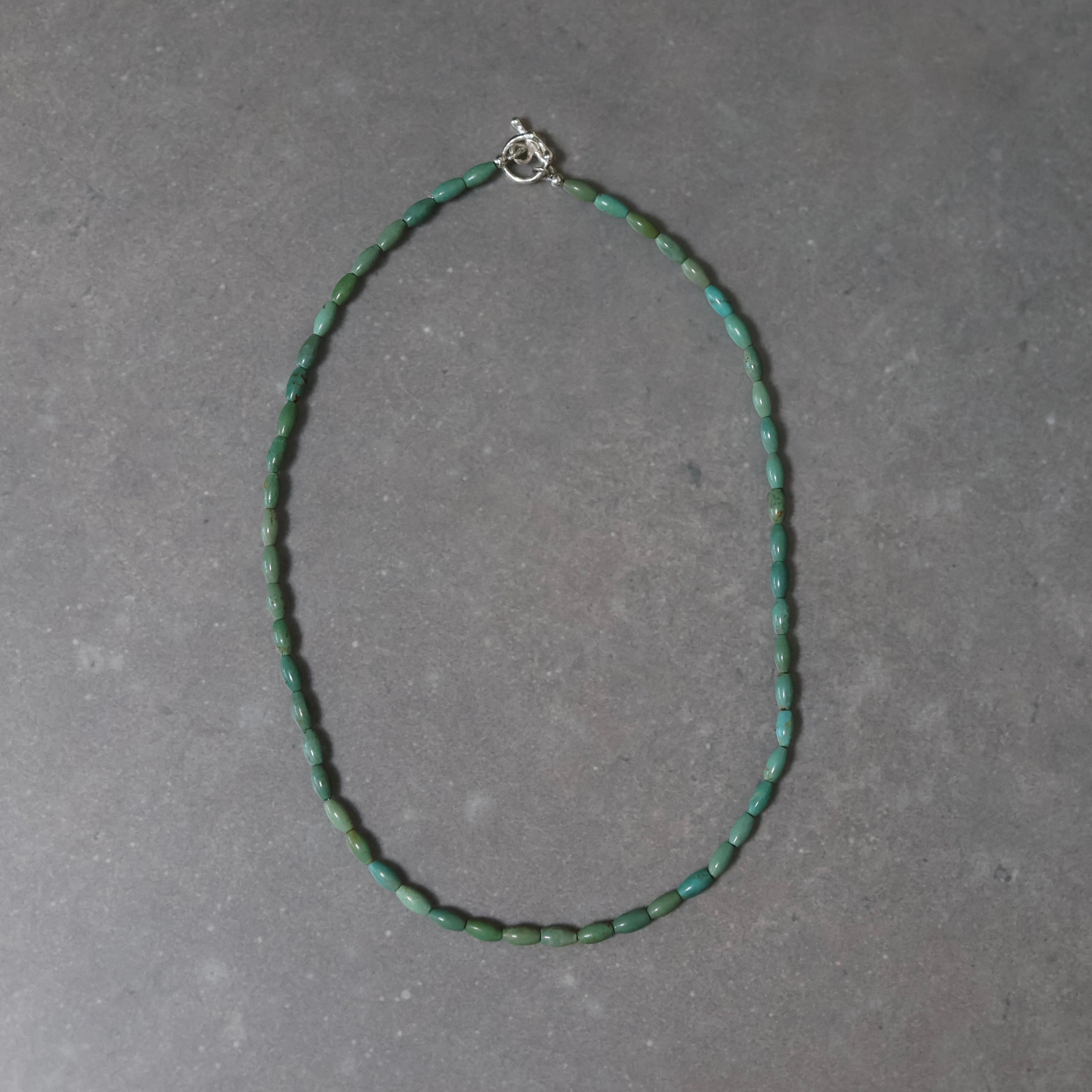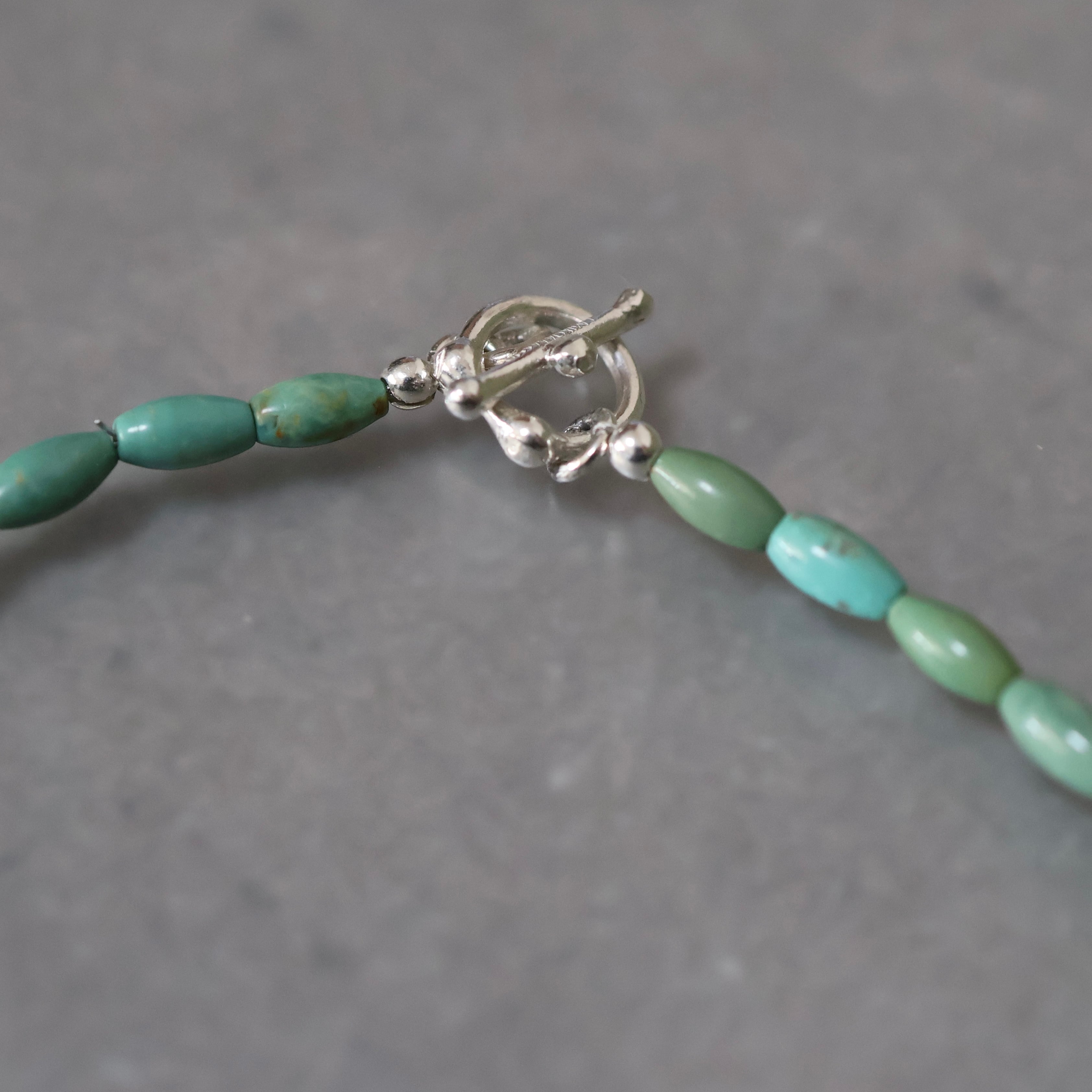 天然石をつかったビーズのネックレスシリーズ。珍しいライス型のターコイズビーズです。ターコイズ古くから自然崇拝の石として世界中で扱われ、多くの部族や時の権力者などに愛されてきた背景を持ちます。