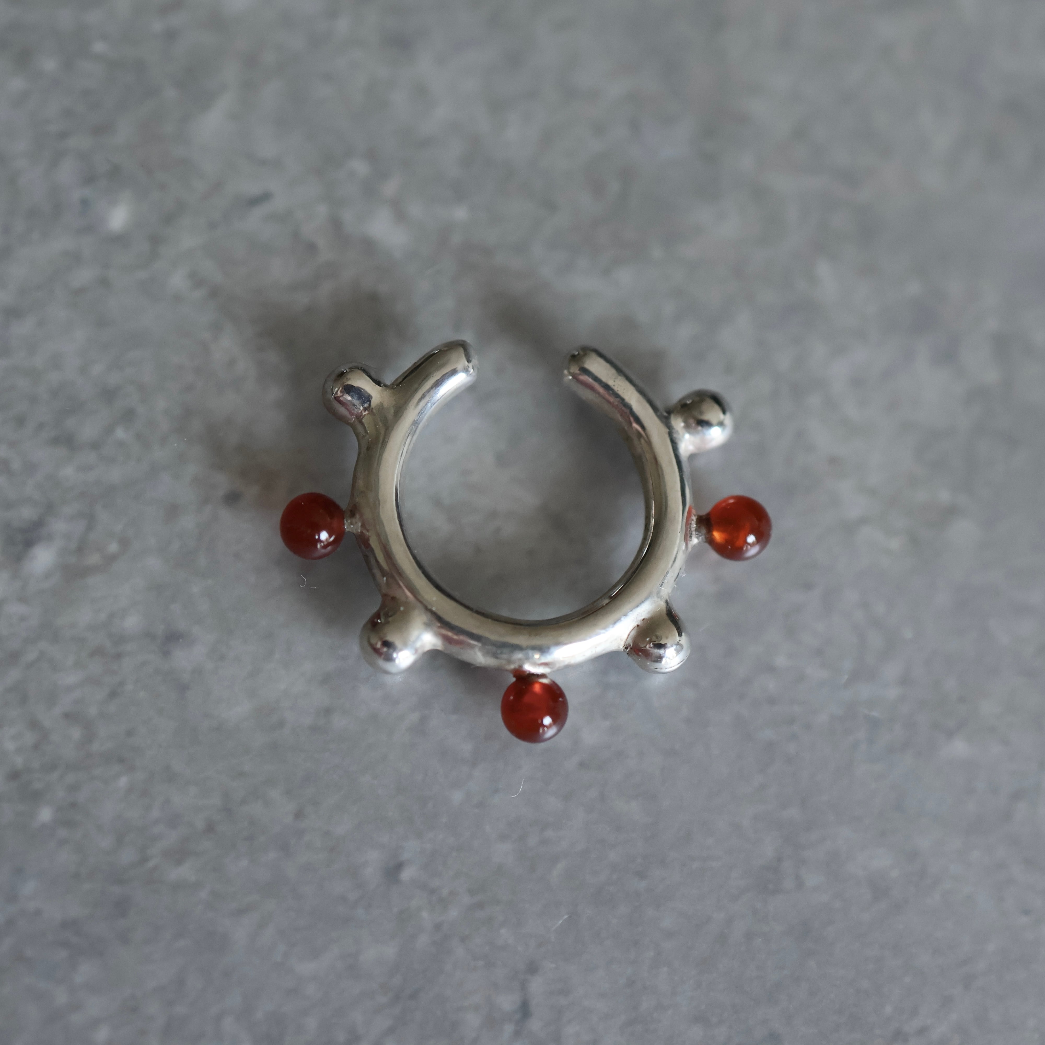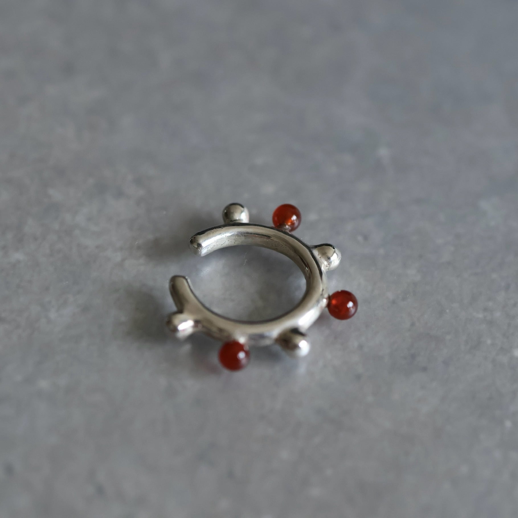 赤いカーネリアンとシルバーのボールが交互に並んだイヤーカフ。